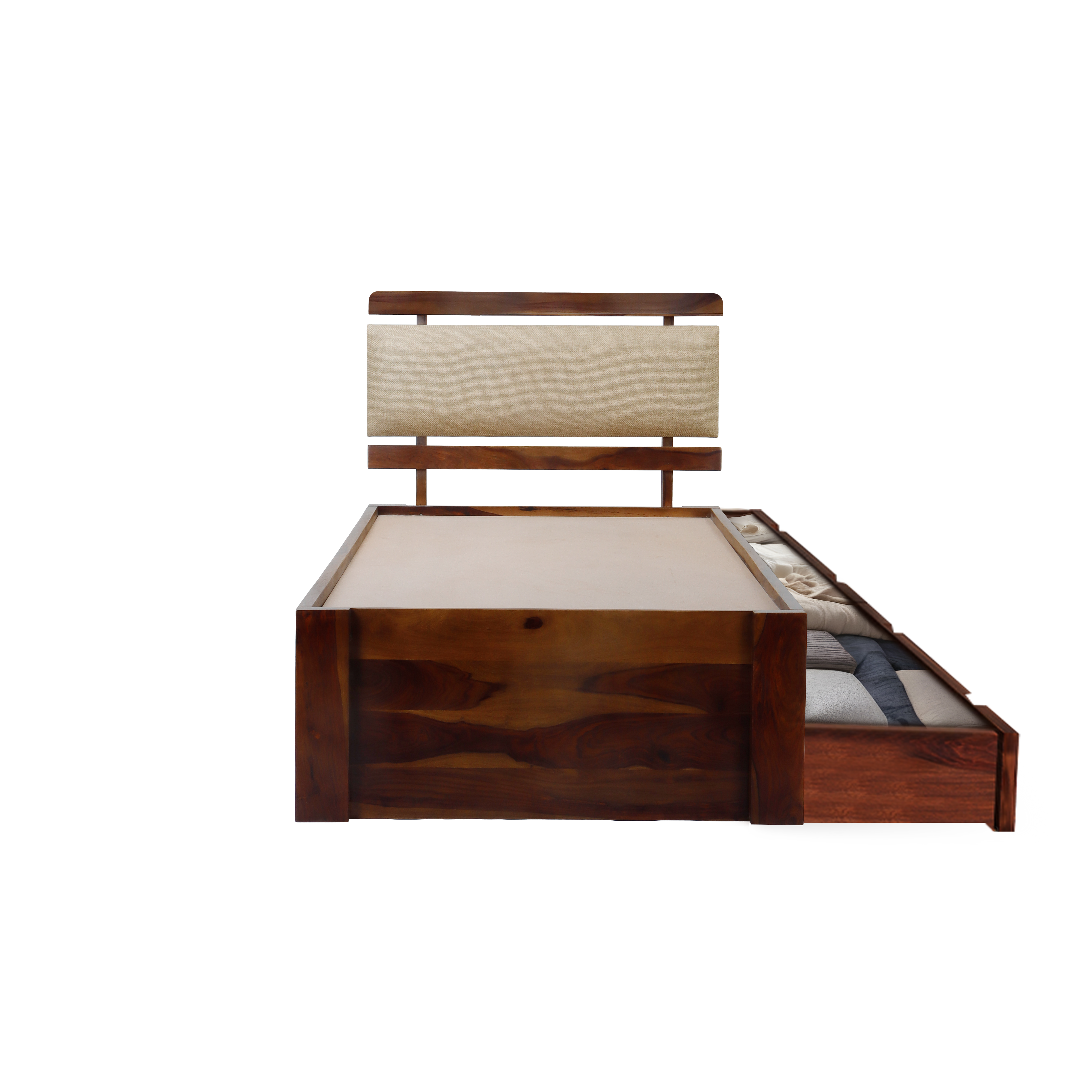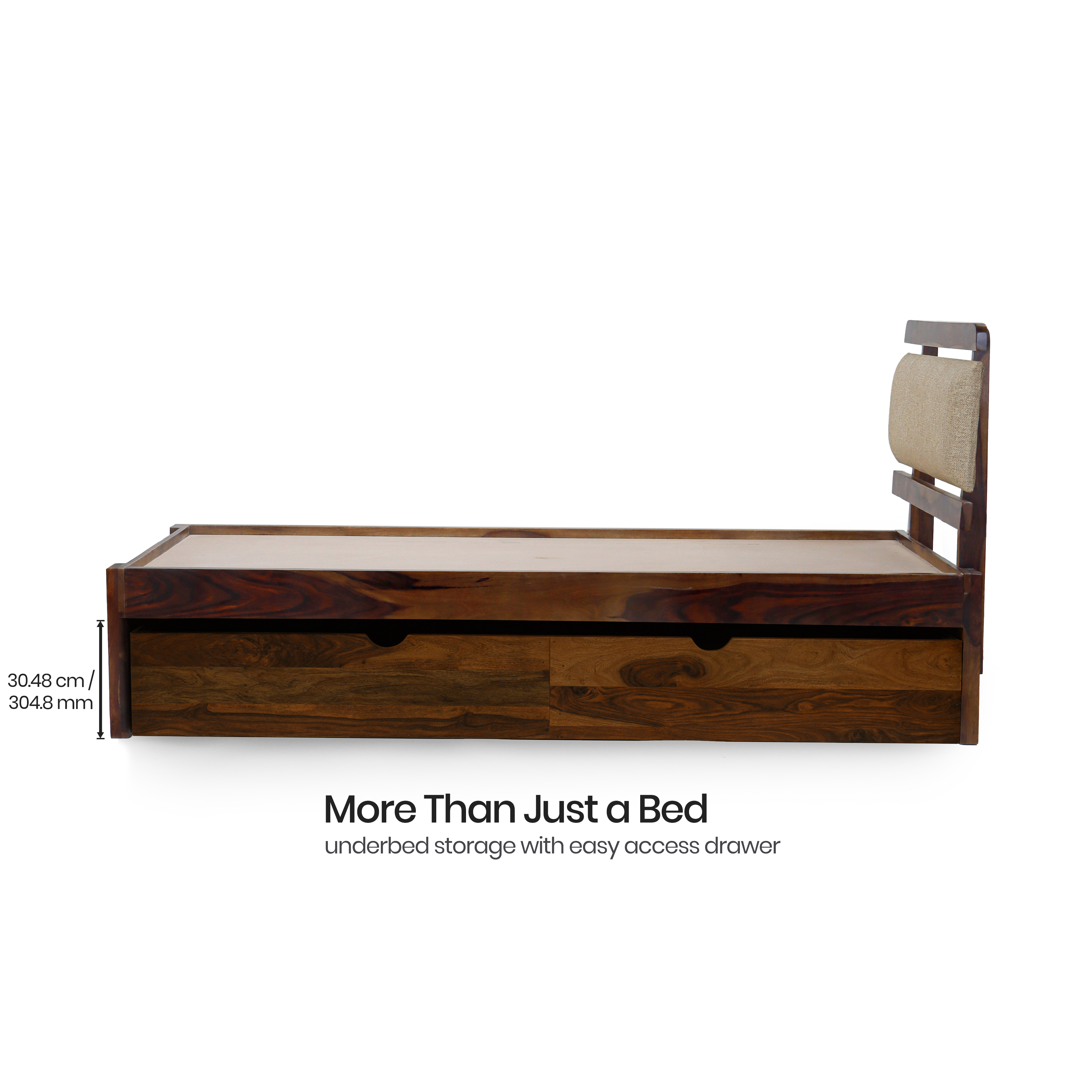 A chic and cozy single bed, perfect for smaller spaces or guest rooms, offering both comfort and style with an under-bed storage solution that maximizes space, offering convenient access to additional storage without sacrificing style.