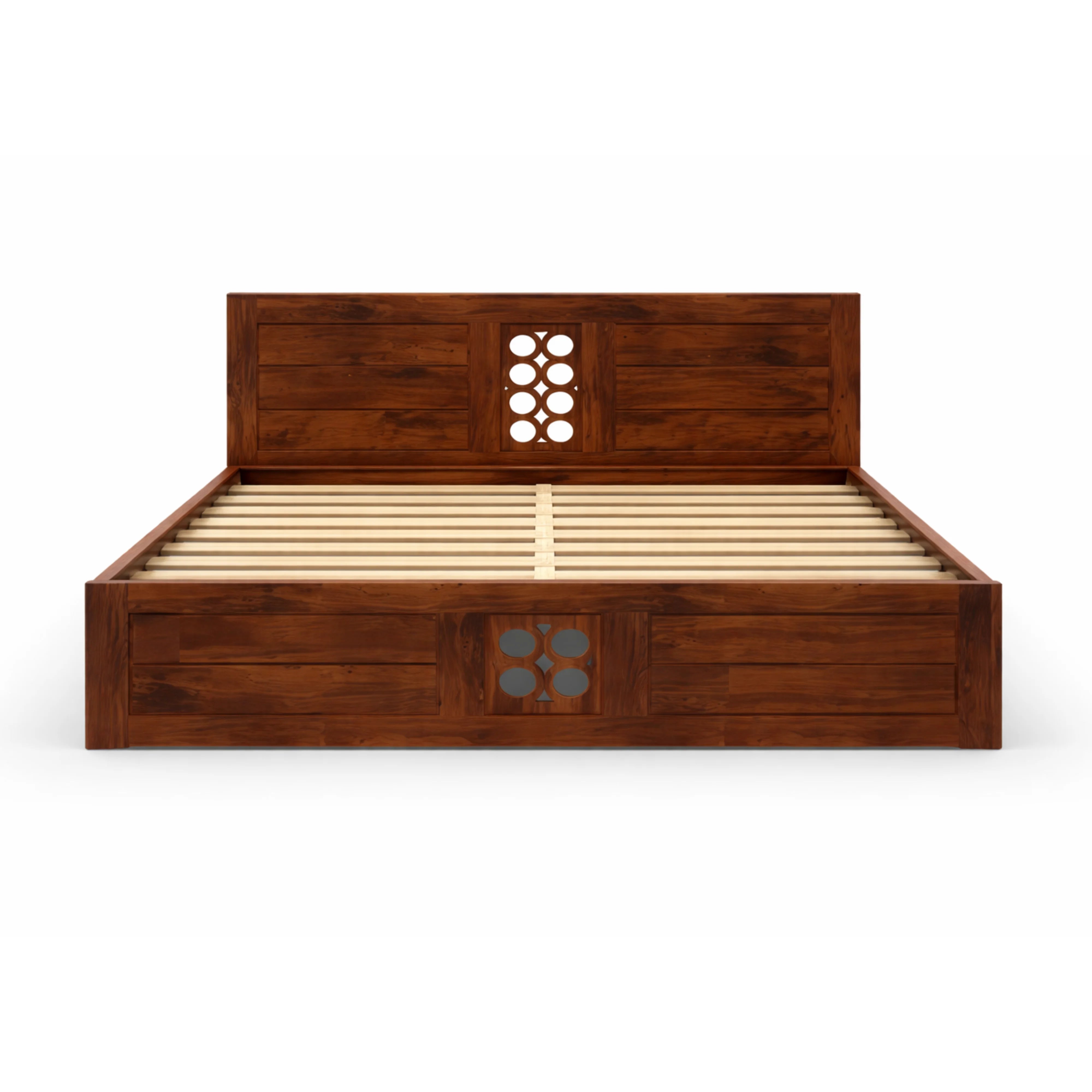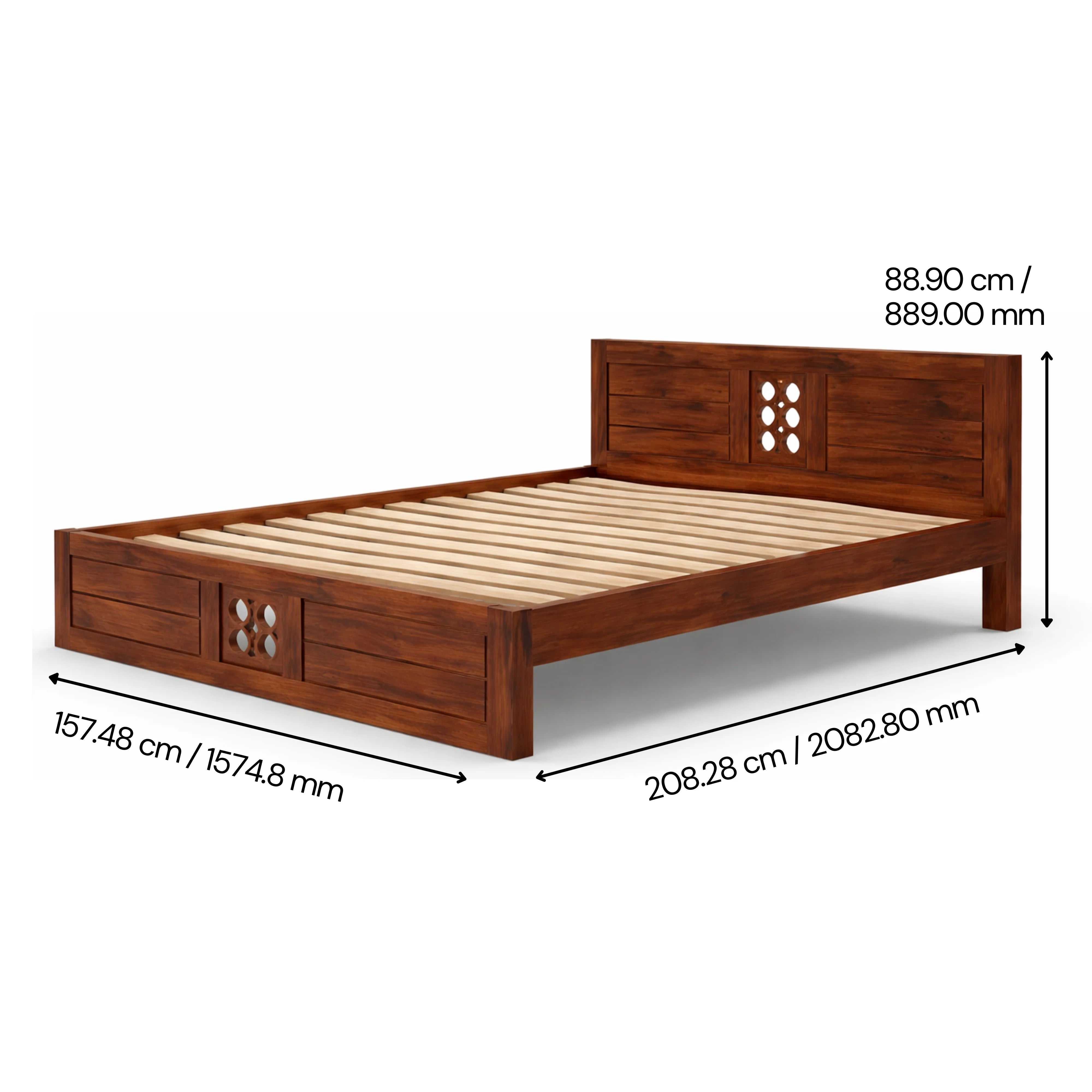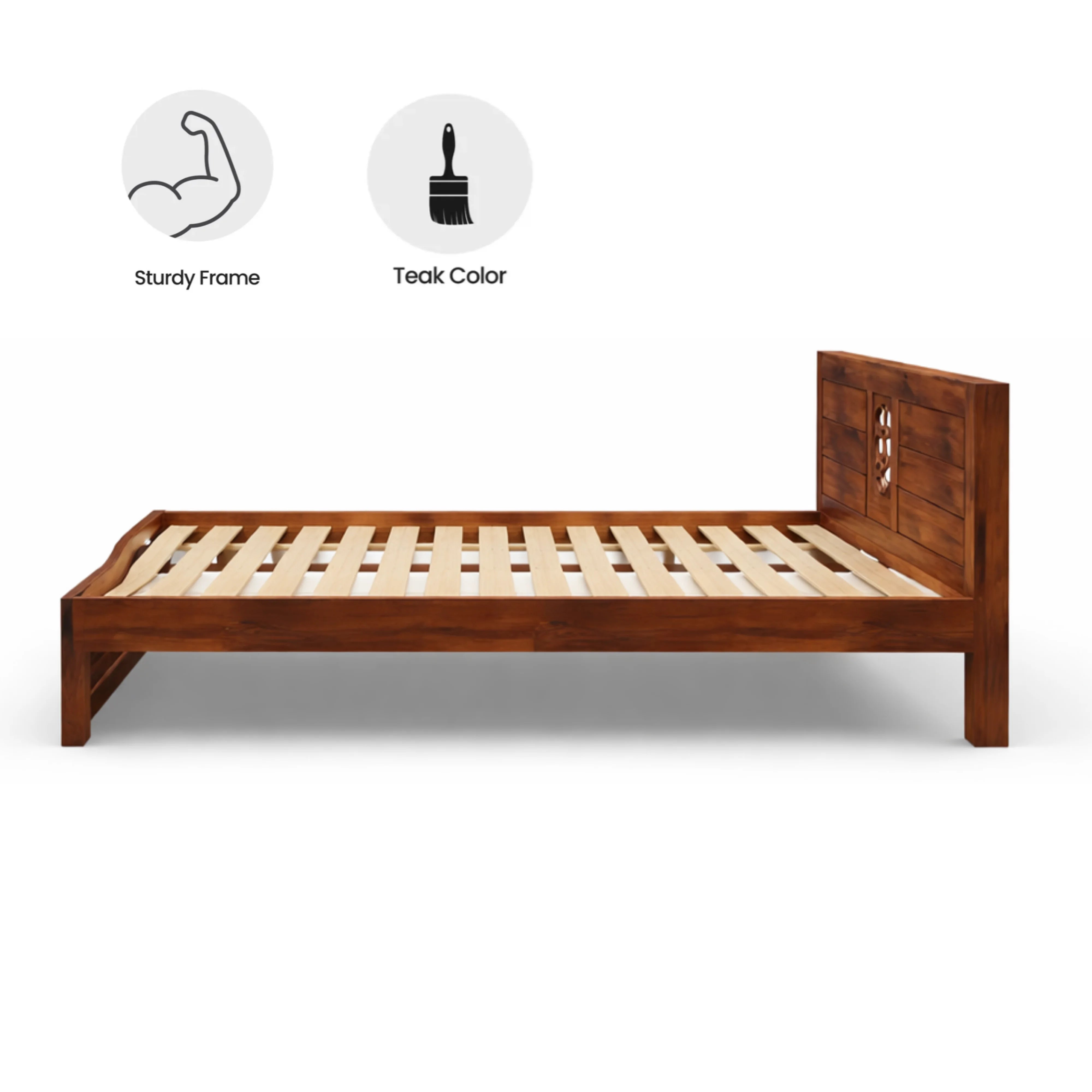Handcrafted sheesham wood queen bed with honey finish and slatted headboard. Durable, elegant design pairs effortlessly with modern and contemporary bedroom décor for timeless sophistication.