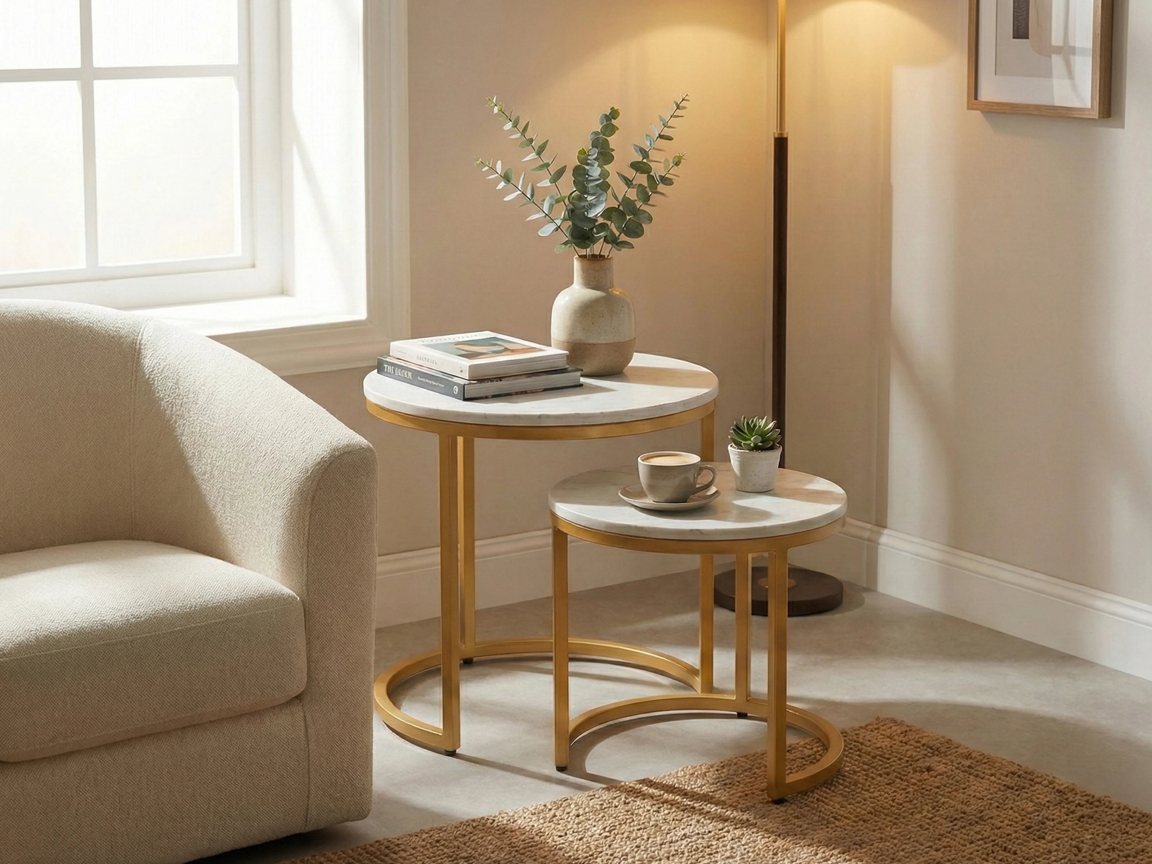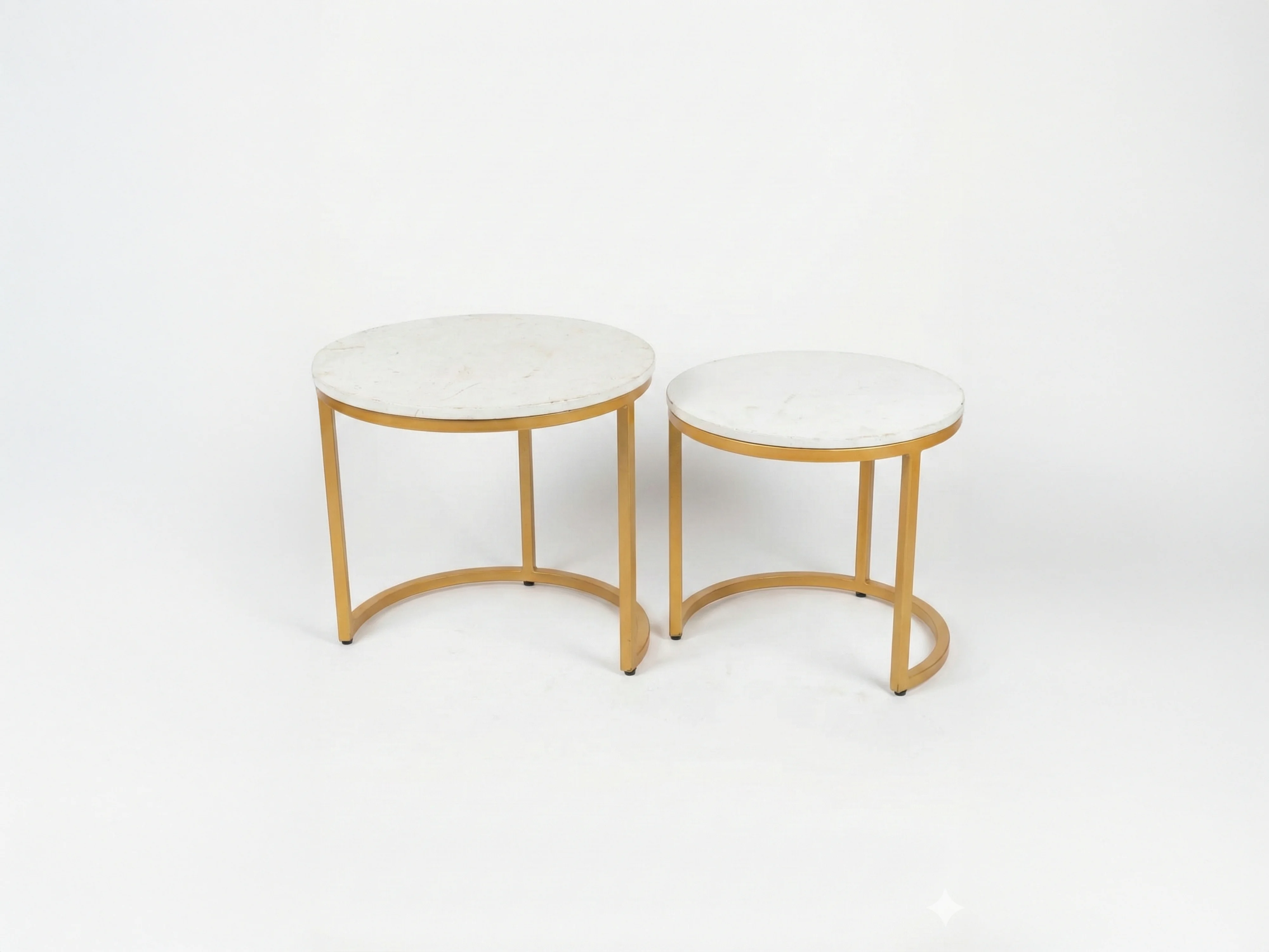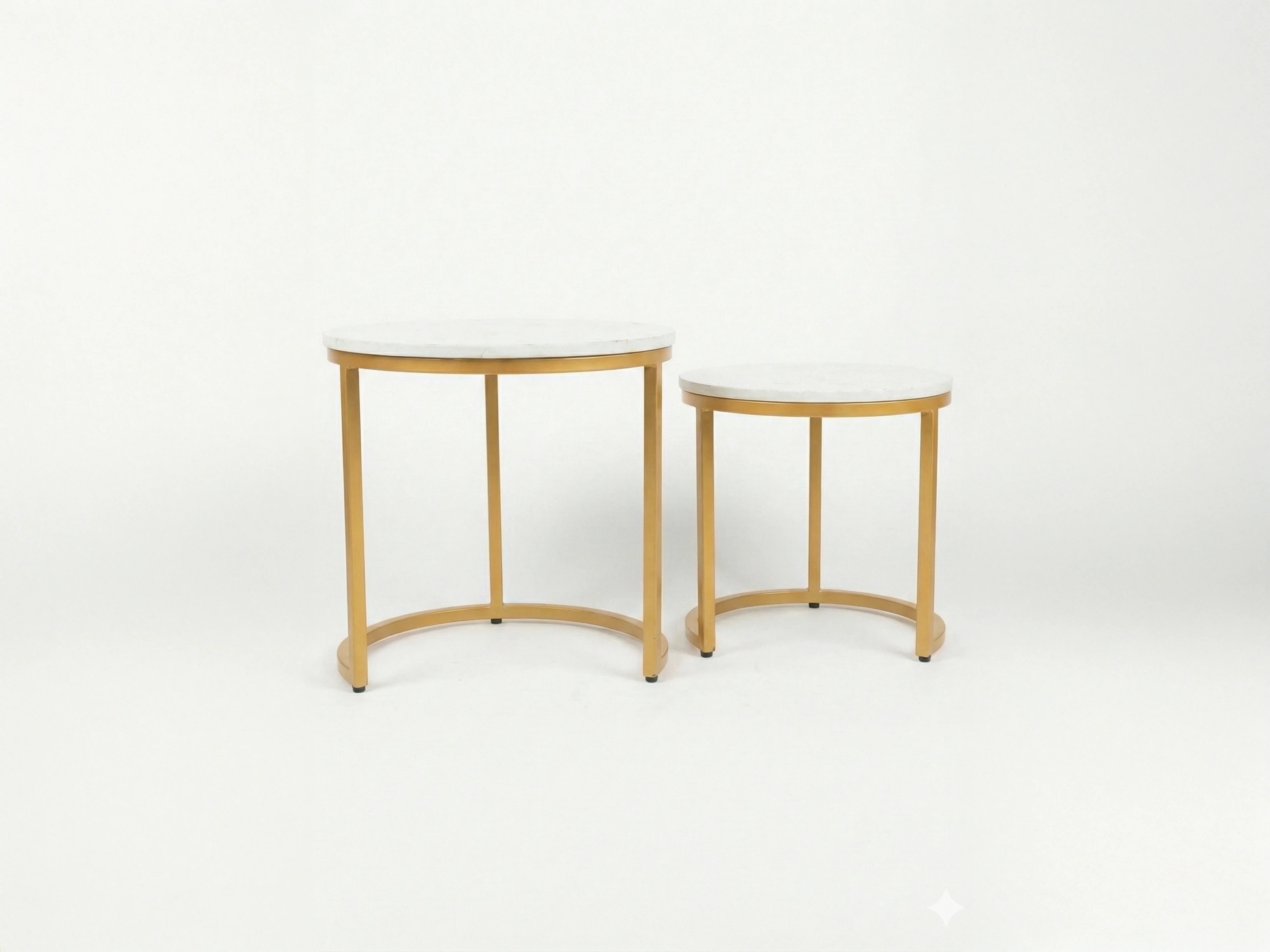 A sleek set of nesting side tables featuring elegant marble tops and a sturdy metal frame. Perfect for compact living, offering flexible styling, durability, and a modern luxury look for any space.