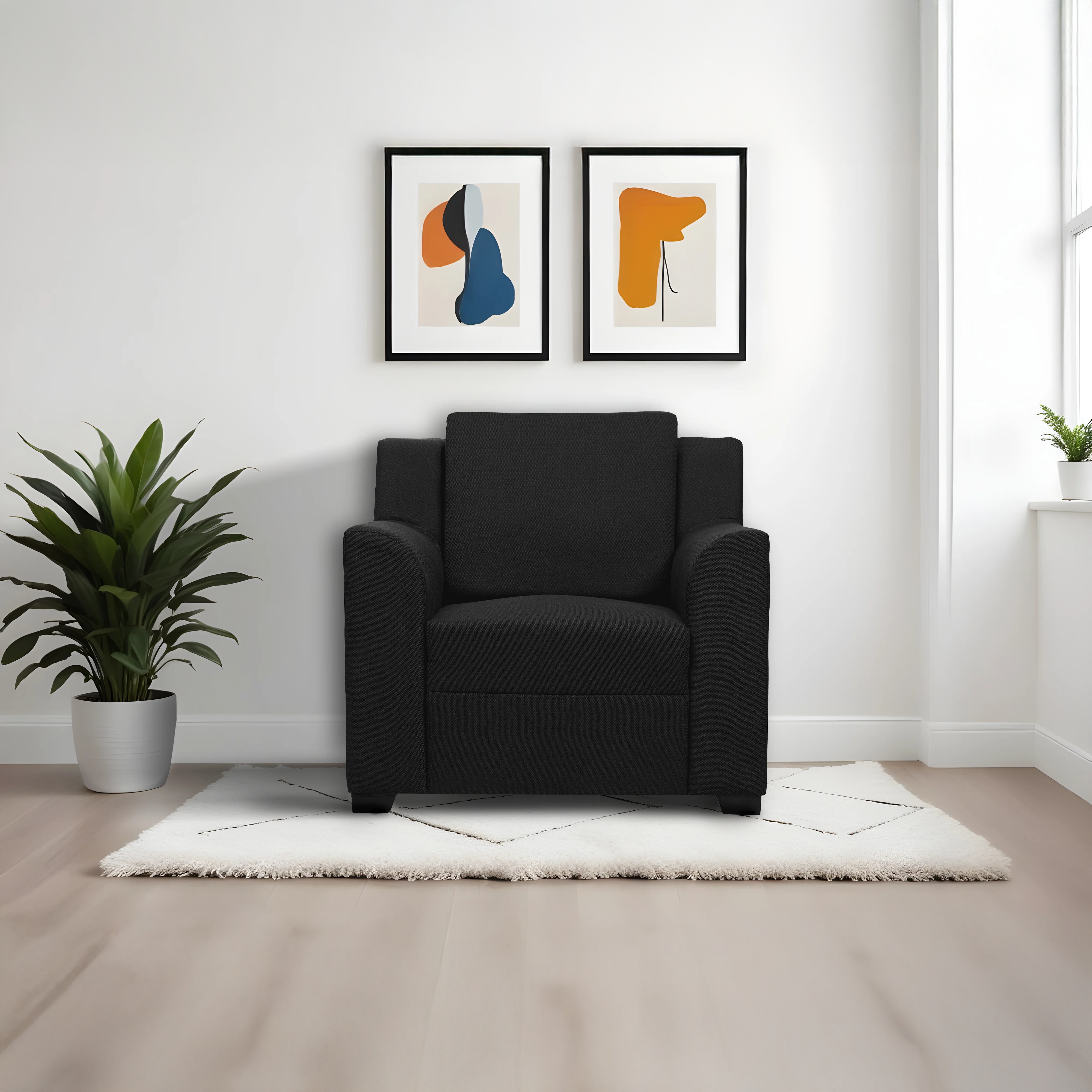 The same cozy single-seater sofa in a sophisticated charcoal color, adding a touch of elegance to your living space.
